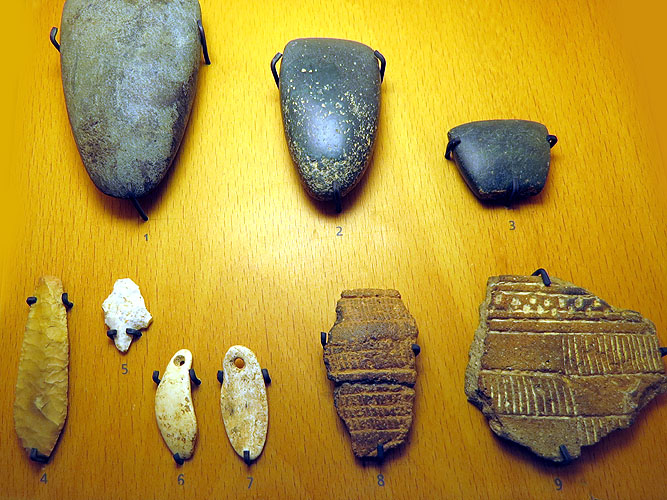 ![]() Destrals votives neolítiques. Fulles de sílex, punta de fletxa, penjolls i fragments de vas campaniforme del Calcolític |