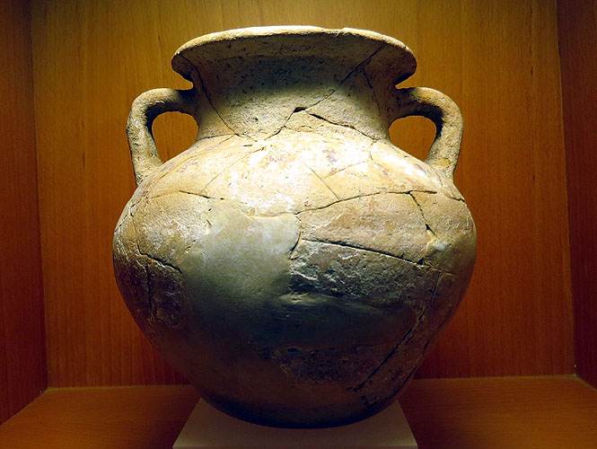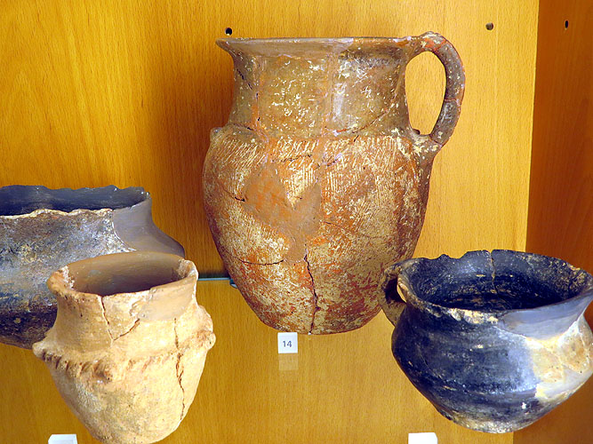 ![]() Ceràmica feta a mà. Esquerra: vaset de perfil en S , decorat amb cordó i mugrons, 600-450 aC. Centre: Gerra de perfil en S, amb una nansa, amb decoració d'incisions i mugrons, 500-450 aC. Dreta: vas carenat amb nansa, 600-500 aC |