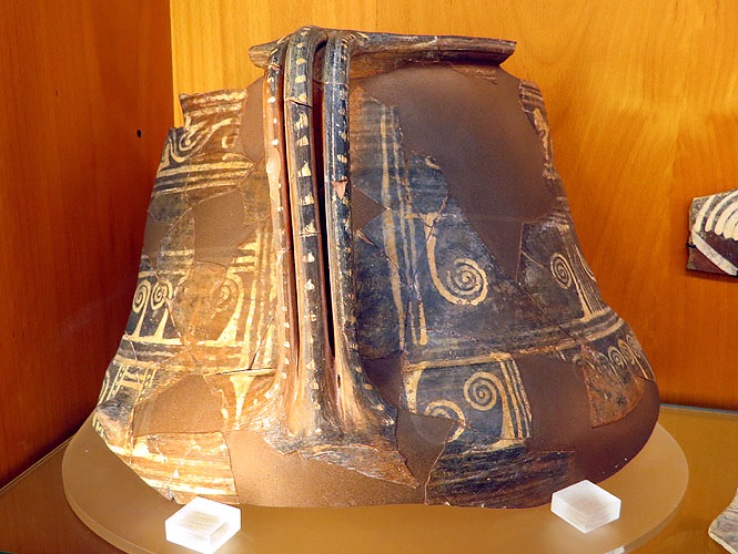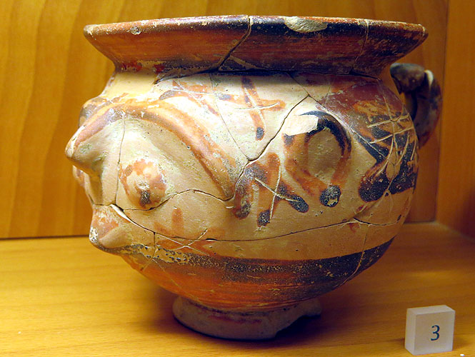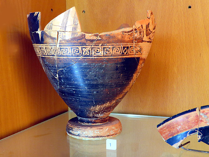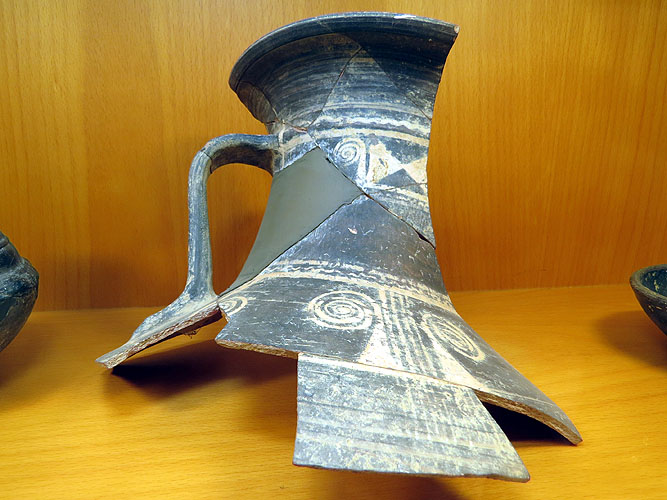 ![]() Esquerra: gerro globular amb nansa de cinta decorat amb una sanefa d'impressions en forma d'espiga a la base del coll, 550-400 aC. Dreta: bol amb carena baixa, 600-500 aC |