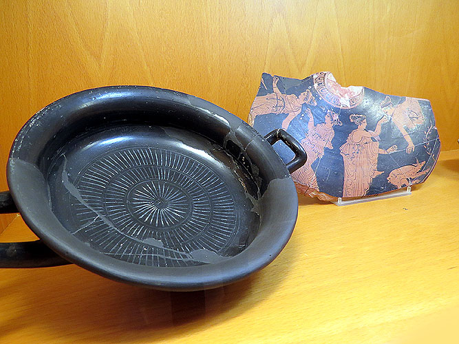 ![]() Esquerra: kylix àtic de peu baix de vernís negre, amb decoració impresa a l'interior. Clase "Delicada", darrer quart segle V aC. Dreta: fragment de tapadora amb figures roges, 420-410 aC |