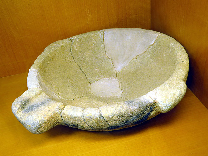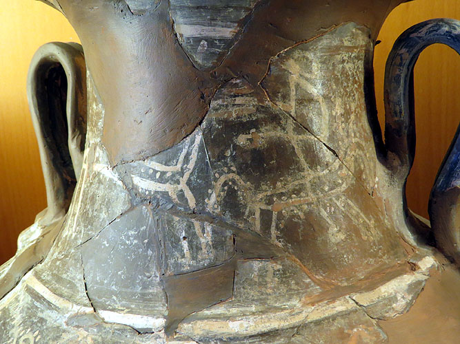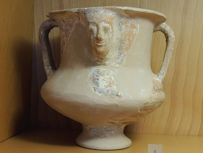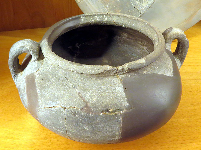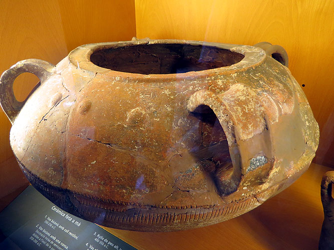 Gran gerra de forma ovoide i vora aplanada, amb quatre nanses. Decoració de mugrons prop de la vora i incisions a la meitat inferior de la peça, 450-350 aC |