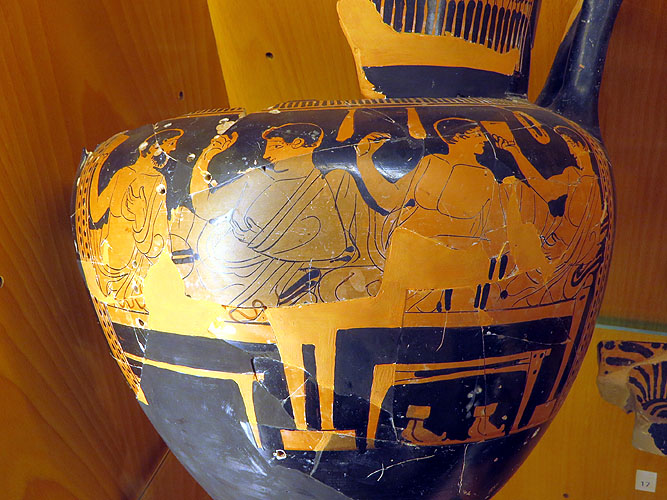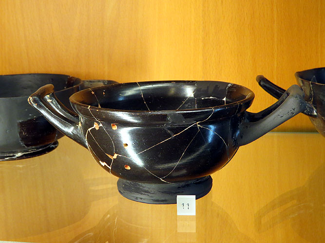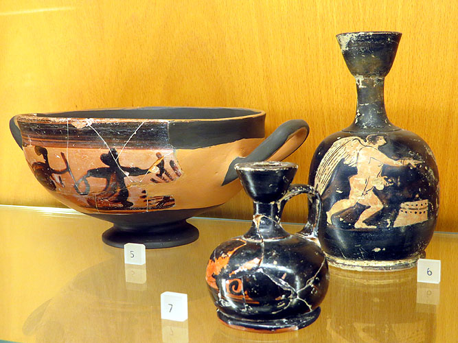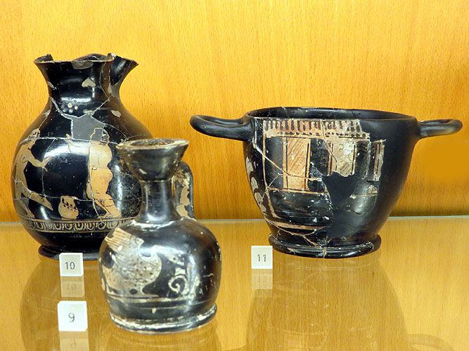 Esquerra: lekythoi aribalístic, finals segle V aC. Centre: oenochoe, finals segle V aC. Dreta: importació àtica de figures roges de la classe de Saint-Valentin |