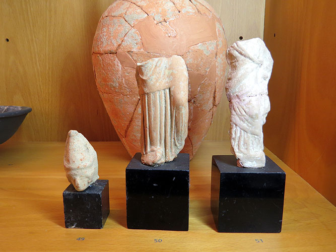 Esquerra: terracota. Cap amb corona egípcia de procedència púnica, segle III aC. Centre i dreta: terracotes. Figures femenines hel·lenístiques, segle III aC |