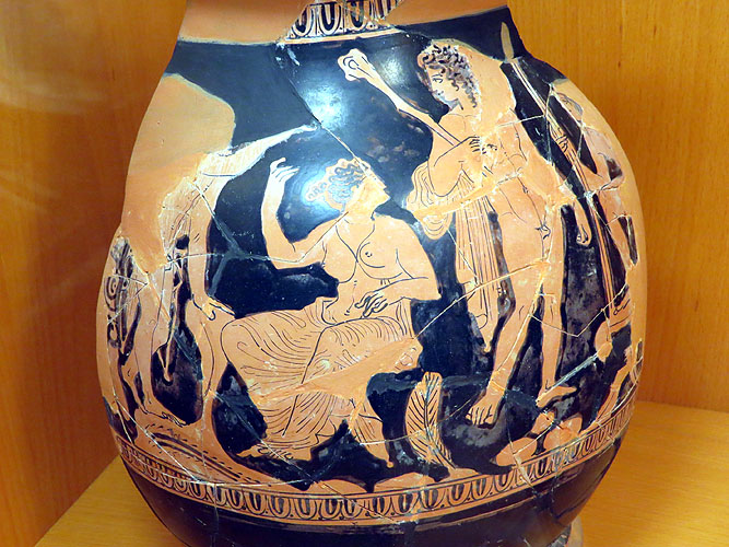 Pelike àtic de figures roges. Enterrament 32. El tema probablement representa Teseu abandonant Ariadna. Pintor de Meleagre. Inicis del segle IV aC |