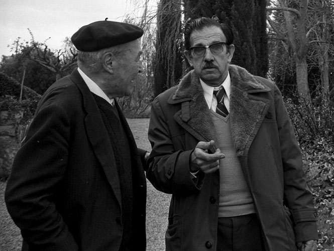 Reunió anual a Ullastret. El nou comissari general d'Excavacions Arqueològiques, Joan Maluquer Motes conversa amb l'escriptor Josep Pla durant la visita al jaciment arqueològic. 27 de febrer 1974. Fotografia Miquel Gil Bonancia. CRDI - Ajuntament de Girona