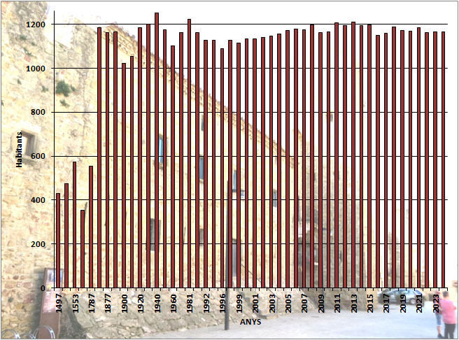 Del castell de Verges en resta un mur d’uns 10 m de llarg per 5 m d’alçària, integrat a la paret posterior de la casa de la vila, edifici de la primeria del segle XX, restaurat i reformat l’any 1990. Aquest mur és paral·lel a la paret meridional de l’església; hi ha quatre sageteres i la resta d’una coberta de lloses. ![]() Assaig de la dansa de la mort a Verges. Ca. 1920. Francesc Blasi i Vallespinosa. Arxiu Fotogràfic Centre Excursionista de Catalunya - (Ampliar) ![]() Evolució demogràfica de Verges. Les dades dels anys 1497-1553 s'han estimat en base als focs: 1497, 66 focs; 1515, 73 focs; 1553, 88 focs. Les dades del període 1717-1981, corresponen a població de fet; a partir de 1990, població de dret. - (Ampliar)
