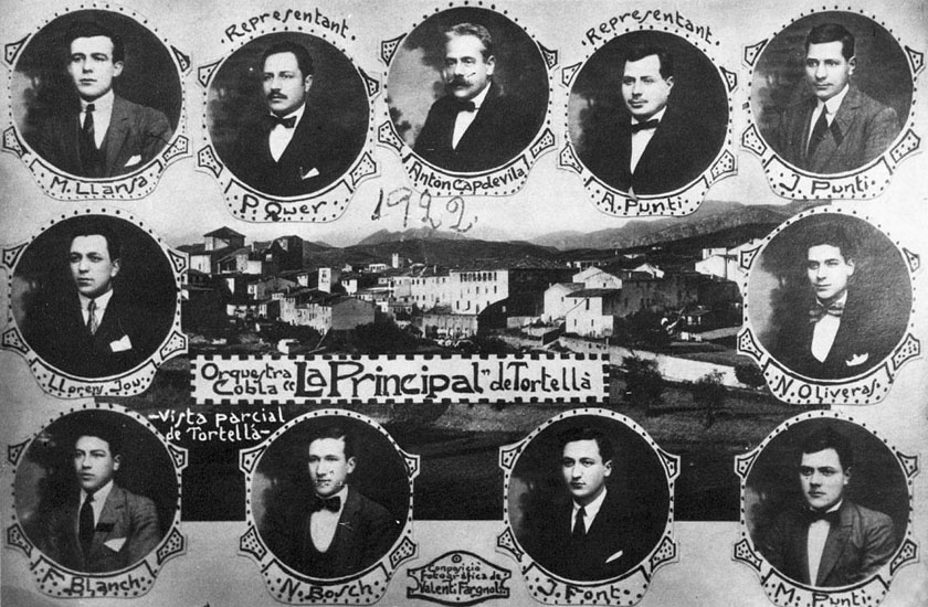 Durant la Tercera Guerra Carlina, el 1873, la vila va ser castigada per la carlinada, que hi provocà un incendi que destruí la major part dels edificis. Les tropes de l'Infant Alfons i la seva muller Maria de les Neus, combinades amb les de Savalls i el seu lloctinent Auguet, que el 20 d'agost de 1873 eren a Ripoll, van traslladar-se a la Garrotxa, per Vallfogona i el coll de Canes, aprofitant la nit, per arribar a Tortellà a l'entrada de fosc del dia 21, després d'haver reposat durant unes hores a Riudaura. De seguida van envoltar la població i començà la lluita pels carrers del poble. ![]() Retrat dels components de la cobla orquestra La Principal de Tortellà sobre un fons amb una vista de la població. D'esquerra a dreta i de dalt a baix: M. LLansa, P. Quer (representant), Anton Capdevila, A. Puntí (representant), J. Puntí, Llorenç Jou, N. Oliveras, F. Blanch, N. Bosch, J. Font i M. Puntí. 1922. Valentí Fargnoli i Annetta. CRDI - Ajuntament de Girona. - (Ampliar)