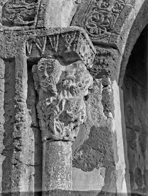Detall d'un capitell de la porta de l'església de Sant Julià i Santa Bassilissa de Corts. 1925. Joan Subias Galter. CRDI - Ajuntament de Girona - (Ampliar)