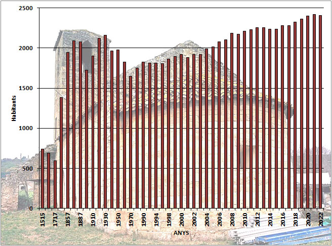 L'església parroquial del poble de Ravós del Terri, dedicada a Sant Cugat, és l’antiga capella del castell de Ravós, del segle XII, castell que apareix esmentat en els documents medievals sota les formes Rogationibus i, també Rabonibus. El castell pertanyia al capítol de Girona i l’ardiaca de Girona tenia el títol de senyor de Ravós. L’església és romànica, modificada; l’absis és semicircular amb arcuacions, però exteriorment resta amagat gairebé del tot per d’altres construccions. Conserva restes de pintures murals romàniques. Era lloc reial. ![]() Evolució demogràfica de Cornellà del Terri. Les dades dels anys 1497-1553 s'han estimat en base als focs: 1497, 108 focs; 1515, 135 focs; 1553, 125 focs. Les dades del període 1717-1981, corresponen a població de fet; a partir de 1990, població de dret. Dades recents extretes d'Idescat. - (Ampliar) Bibliografia