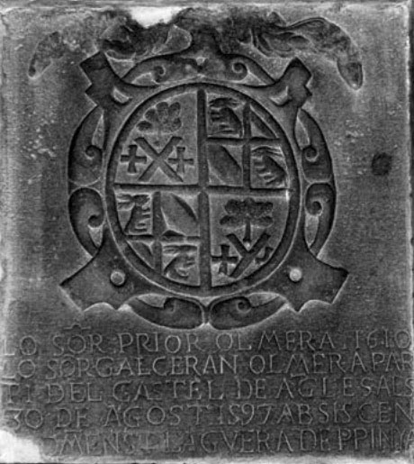 Làpida de Galceran d'Olmeda a l’església parroquial de Santa Maria de Sales, la Cellera de Ter. Publicat a "Santa Maria de Sales...", op. cit. - (Ampliar)