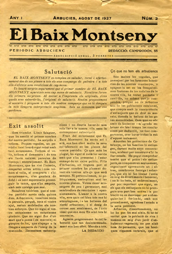 Premsa local. Periòdic 'Baix Montseny'. Número 2. Agost de 1927. Biblioteca d'Arbúcies - (Ampliar)