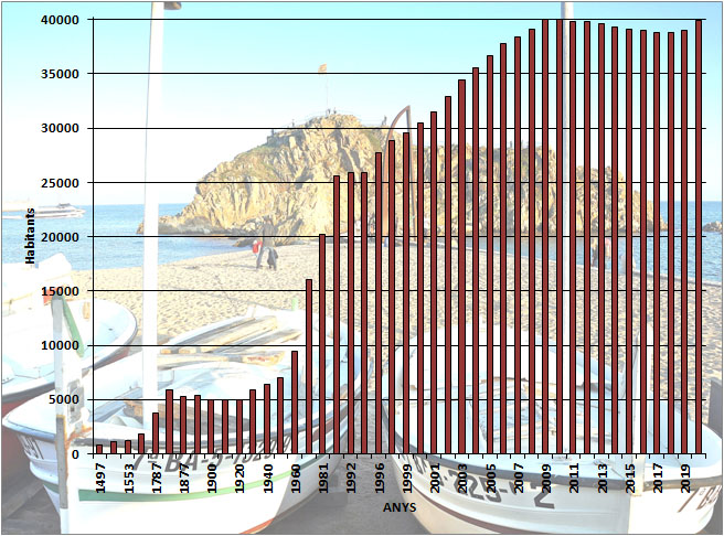 Evolució demogràfica de Blanes. Les dades dels anys 1497-1553 s'han estimat en base als focs: 1497, 152 focs; 1515, 204 focs; 1553, 220 focs. Les dades del període 1717-1981, corresponen a població de fet; a partir de 1990, població de dret. Dades recents extretes d'Idescat. - (Ampliar)