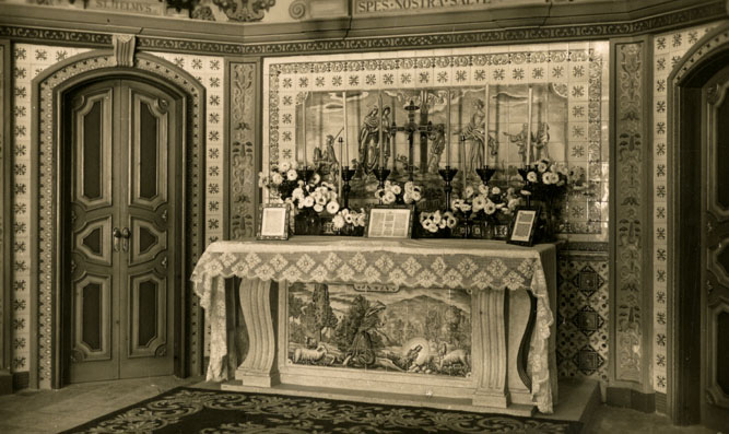 Santuari de la Mare de Déu. del Vilar. L'Altar Major amb els dos plafons de ceràmica. 1930. Autor desconegut. CRDI - Ajuntament de Girona - (Ampliar)