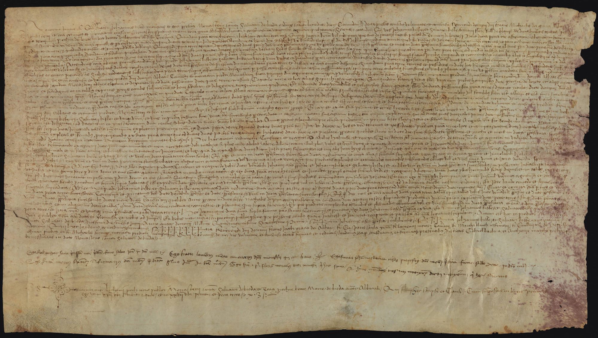 El primer vestigi d'ocupació de l'espai que avui coneixem com Breda, és un nucli Levallois sobre ascla de sílex, trobat en un indret no identificat dels voltants de la riera de Breda. Aquesta eina de pedra és la troballa més antiga que s'ha fet en tota la zona del Montseny. ![]() Reducció de tasca. Sant Salvador de Breda. 20 de juny 1461. Detall de la signatura. Fra Joan Cises, prior del monestir benedictí de Sant Salvador de Breda, amb el consentiment de l'abat i la comunitat, atorga als germans Joan i Salvador Bisbe, de Blanes, una reducció de la tasca per emfiteusi de 15 jugades de terra erma i boscana al lloc dit "Vallarnau" o "Santa Cristina" del terme de Lloret, que passa a ser un cens de 9 diners anuals. Per aquesta reducció reconeix haver rebut 13 sous. Biblioteca de Catalunya. Perg. 302, Reg. 20714. - (Veure sencer) Santa Maria de Breda.