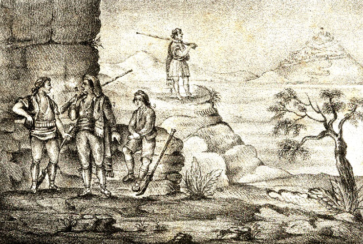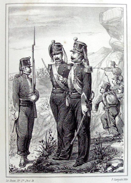 Uniformes del batalló que manà el coronel Josep Manso durant la Guerra del Francès. Gravat de J. Serra, 1861. SGDAP Ajuntament de Girona. -