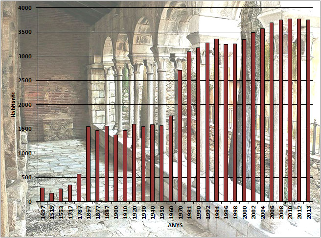En aquests anys de guerra, el cenobi de Sant Salvador va quedar desert gairebé un any (1809) a causa del setge d’Hostalric; les tropes napoleòniques instal·laren el campament a Gaserans i les incursions dels soldats motivaren que molts habitants de masies i els mateixos monjos, després d’haver assegurat un bon amagatall per a les joies i les peces de més valor per al culte, cerquessin refugi en llocs més segurs. Tanmateix, els francesos se n'emportaren disset campanes. ![]() Evolució demogràfica de Vidreres. Les dades dels anys 1497-1553 s'han estimat en base als focs: 1497, 41 focs; 1515, 25 focs; 1553, 38 focs. Les dades del període 1717-1981, corresponen a població de fet; a partir de 1990, població de dret. - (Ampliar)