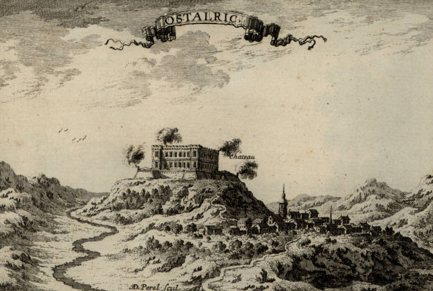 Durant el segle XVIII es va construir l'actual castell, concebut com a fortalesa militar sota un projecte de l'enginyer militar flamenc Joris Prosper Van Verboom. Les primeres obres de fortificació permanents van tenir lloc durant el 1712 i 1713 a conseqüència de la Guerra de Successió Espanyola, tot i que les principals obres per deixar en condicions d'ús la fortificació van ser entre 1794 i 1795, en el transcurs de la Guerra Gran. El 7 de novembre de 1809, en plena Guerra del Francès, les tropes napoleòniques varen saquejar les cases i calar foc al poble d'Hostalric. El castell, però, va resistir. El 12 de maig de 1810, després de sis mesos de setge, 800 soldats que formaven part de la guarnició del castell es van poder escapar del setge de les tropes napoleòniques. ![]() El castell d'Hostalric, segons gravat de Beaulieu, 1668. Forma part de "Les Plans et profils des principales villes, et lieux considerables de la Principauté de Catalogne: avec la carte génerale et les particulières de chaque gouvernement". Institut Cartogràfic de Catalunya. - (Ampliar)