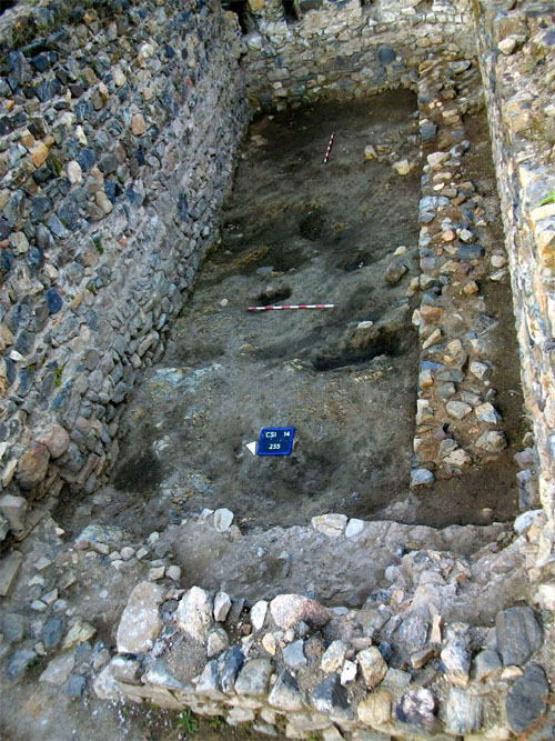 A l'extrem oposat d'aquesta torre n'hi ha una altra de rodona, unida a la primera per una muralla atalussada. La porta d'entrada a la fortificació està situada a l'angle oposat d'aquest conjunt. L'aparell visible d'aquests últims elements són grans carreus, d'uns 35 x 35 cm, intercalats amb filades de pedres llargues i estretes. De la capella del castell, dedicada a sant Iscle i santa Victòria, resta part de l'absis semicircular amb una obertura d'esqueixada senzilla i una ampliació de forma rectangular. Els seus carreus són escairats però sense polir. Està situada fora del recinte sobirà del castell, prop del fossar. De l'absis en destaquen la fornícula i els dos espais quadrats que hi ha a cada costat. ![]() Ceràmica localitzada durant l'excavació de 2011. Joan Llinàs - Generalitat de Catalunya - (Ampliar) El 2004 l'Ajuntament de Vidreres va endegar un projecte d'intervenció arqueològica global en el recinte del castell. A partir d'aquest moment s'hi han realitzat campanyes d'excavació que han permès documentar els diferents àmbits del castell. La campanya de 2005 es va centrar en la capella romànica de Sant Iscle, reconstruïda al segle XV i reformada novament al XVI. També es van efectuar tasques de neteja a l'interior del castell, posant al descobert les restes d'un pati porticat adossat a les restes de la torre de l'homenatge del castell fundacional. Pati i torre van ser novament excavats el 2006 juntament amb les torres nord-oest i sud-oest i l'ala oest del castell. L'any següent es documentà que la torre de l'homenatge estava construïda sobre una necròpoli anterior al castell, probablement dels segles IX-X. ![]() El castell de Sant Iscle. 2012. Manel Lladó Aliu. CRDI - Ajuntament de Girona - (Ampliar) La campanya de 2008 es va centrar en la part sud-est del recinte, on es va documentar una gran estança on hi havia una cisterna i una altra habitació, més petita, al nord. També es va començar a intervenir al cos oest. El 2009 continuaren els treballs al sector sud-est i al cos oest per conèixer la distribució de les estances de la planta baixa del castell. Aquests treballs continuaren durant les campanyes arqueològiques de 2010, 2011 i 2012, documentant-se noves estances i estructures, i posteriorment, els anys 2015, 2018, 2019 i 2021. Bibliografia (Imatges base capçalera: Viquipèdia) |