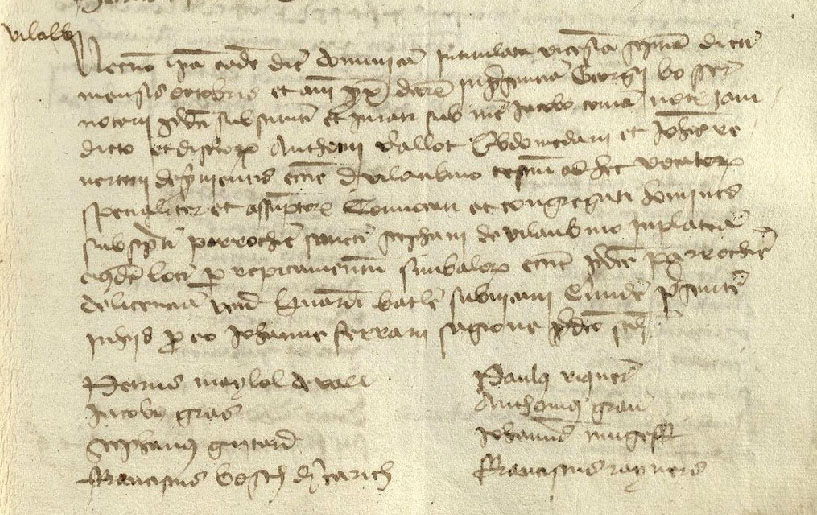Necnon ipsa eadem die dominica intitulata vicesima septima dicti mensis octobris et anni proxime dictorum, in presentia Georgii Bosser, notarii pred icti substituti et iurati sub me Iacobo Coma, notario iam dicto, et discreti Anthonii Ulallot, ebdomedari, et Iohannis Reverterii, deservientis ecclesie de Vilaubino, testium ad hec vocatorum specialiter et assumptorum, convocati et congregati homines supscripti parrochie Sancti Stephani de Vilaubino, in platea eiusdem loci per repicamentum simbalorum ecclesie predicte parrochie, de licentia venerabilis Bernardi Batle, subvicarii Gerunde, presente in hiis pro eo