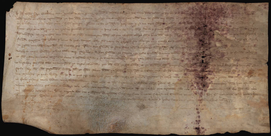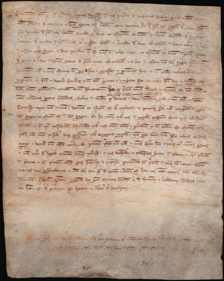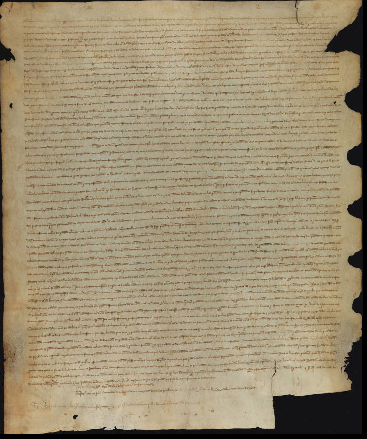 Pergamí. 1347, agosto 30. Sentència arbitral. Francesc de Terrades i Alfons Xifré, àrbitres de la querella entre els marmessors de Guillem Busquets i Pere Fresolf, clergue de la catedral de Girona i titular del benefici instituït pel difunt a l'església de Sta. Eulàlia de Vallcanera, dicten sentència arbitral en favor d'una donació feta pel difunt. Arnau de Mont-rodon, bisbe de Girona (1335-48) subscriu i confirma.