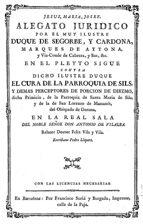 Portada del Alegato juridico por el muy ilustre Duque de Segorbe, y Cardona, Marques de Aytona, y Viz-Conde de Cabrera, y Bas, &c.: en el pleyto que sigue contra dicho ilustre duque el cura de la parroquia de Sils, y demas perceptores de porcion de diezmo, dicha primicia, de la Parroquia de Santa Maria de Sils, y de la de San Lorenzo de Massanet, del Obispado de Gerona / en la Real sala del noble señor Don Antonio de Vilalba; relator doctor Felix Vila y Vila; escribano Pedro Llopart, 1779. Col·legi d'Advocats de Barcelona - (Ampliar)