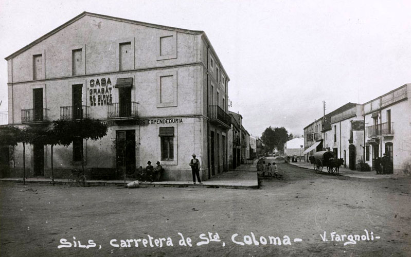 Fins la dessecació de l’Estany, el veïnat de la Granota es vertebrava a partir del vell camí de Barcelona a Girona pel Maresme, actualment la N-II, i del brancal secundari que arribava a Vidreres partint de la zona de l’hostal de la Granota. La riba oriental de l’Estany era el seu límit natural, i les cases del veïnat es comunicaven amb Sils en barca a través de l’estany (les embarcacions es paraven en unes roques que hi havia prop de Matamala) i per via terrestre travessant el sector meridional de la Barceloneta, mitjançant un camí que seguia la riba de l’estany. Més endavant el veïnat s’engrandí amb la major part de les terres guanyades a l’aigua. ![]() Carretera de Sils, anomenada carretera de Santa Coloma. En primer terme s'observa una casa que serveixen menjar. 1911-1936. Valentí Fargnoli Iannetta. CRDI - Ajuntament de Girona - (Ampliar)
