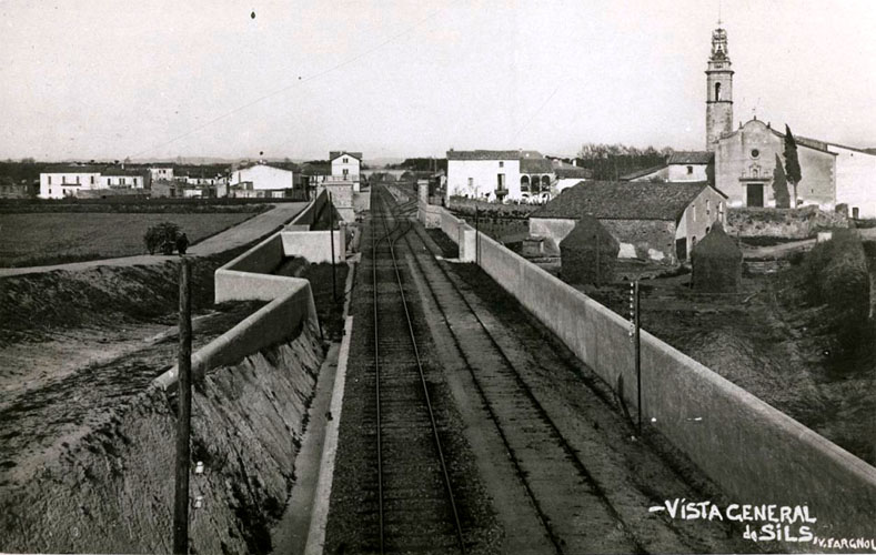 Per tant, les cases de Sils no es troben disseminades, sinó que s’aglomeren al voltant de l’església des d'èpoques reculades. En total, i descomptant l’església i la rectoria, actualment es conserven d’aquest nucli primitiu una mitja dotzena d'habitatges unifamiliars i originalment destinades a l’explotació agrícola, cases de pagès tant des del punt de vista funcional com tipològic. Quan les sagreres havien perdut ja les seves funcions, es pot comprovar com Can Llunès i Ca l’Alzinelles-Can Genari conserven encara l’estructura orientada seguint fidelment el traçat dels límits de la línia de protecció. ![]() Vista de les vies de tren. Al fons s'observa la façana i el campanar de l'església de Sils. 1930-1936. Valentí Fargnoli Iannetta. CRDI - Ajuntament de Girona - (Ampliar)