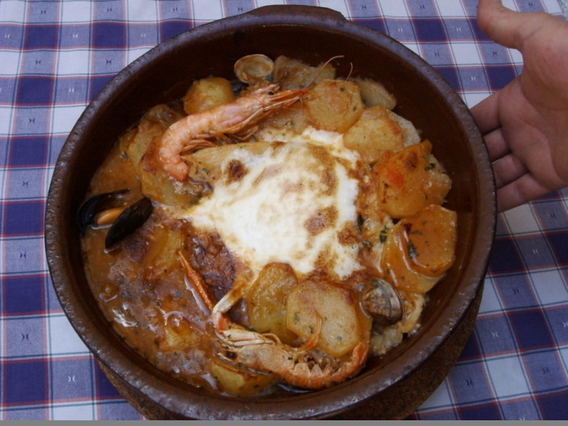 Posar un bon raig d'oli d'oliva en una cassola de fang prèviament escalfada, a foc lent. Quan sigui calenta ja es pot donar-li més foc; el fang no vol canvis bruscos de temperatura. Utilitzar uns trossos grans de rap, que no té gens d'espines, així com els lloms de la lluerna i de l'escórpora que ha servit per al brou; aquest plat sempre es fa amb peix sense espines. Salar el peix i enfarinar-lo. Fregir-lo per segellar-lo, i reservar.