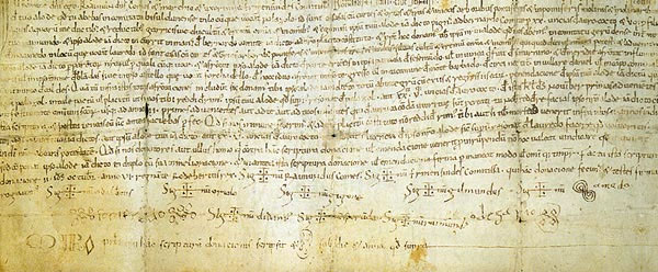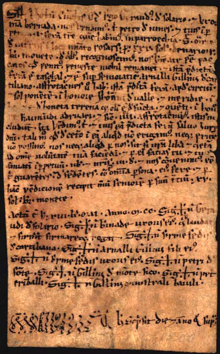 El 218 aC, data del desembarcament de l'exèrcit romà de Gneu Corneli Escipió a Emporion, va marcar l'inici del declivi de la cultura ibèrica i el principi d'un procés de romanització; la presència romana va durar més de 600 anys. ![]() Pergamí datat el 14 d'octubre de 1001. Primera referència documental al terme de Vidreres - (Ampliar) Els senyors de Cabrera.