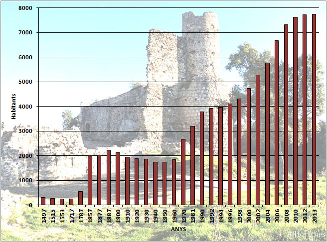 L'any 1952 es va instal·lar a Vidreres la indústria lletera RAM que va ser un motor econòmic pel poble. Aquesta indústria va arribar a donar feina a 300 treballadors, molts dels quals eren immigrants d'Andalusia i Extremadura. Als anys 60 es produí un important creixement que va anar acompanyat amb la realització de noves infraestructures. La dècada dels 70 varen ser anys de construcció d'urbanitzacions per cases de segona residència, bàsicament per a la gent de la zona de Barcelona. Tota aquesta activitat va fer augmentar la població que passà de 1.845 habitants el 1960 a 2.677 el 1970. ![]() Evolució demogràfica de Vidreres. Les dades dels anys 1497-1553 s'han estimat en base als focs: 1497, 78 focs; 1515, 64 focs; 1553, 77 focs. Les dades del període 1717-1981, corresponen a població de fet; a partir de 1990, població de dret. - (Ampliar)