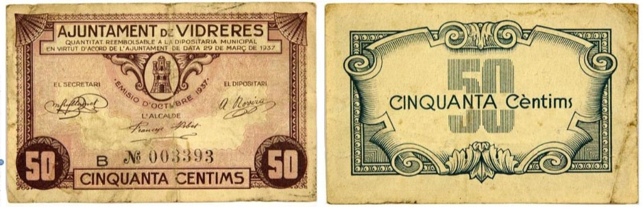 Durant la Guerra del Francès, el 1808 van passar les forces franceses que es dirigien a Barcelona, el 1809 van passar les tropes italianes aliades dels francesos al setge de Girona i el 1810 ho van fer les tropes espanyoles. Més tard, durant la tercera guerra carlina (1872-1875) la vila va ser assetjada diverses vegades pels carlistes. ![]() Bitllets emesos en virtut d'acord de l'Ajuntament de Vidreres de data 29 de març de 1937. Biblioteca de Catalunya - (Ampliar) La Guerra Civil: el camp d'aviació i el búnquer de Can Vall-Llosera. Vidreres va ser un poble republicà fins al 2 de febrer de 1939 quan les tropes nacionals van entrar i es va implantar el franquisme fins a l'any 1975. Durant la Guerra Civil, el 1937, es va construir un camp d'aviació al Pla i es començà a utilitzar el 1938. També es va construir un búnquer a can Vall-llosera i trinxeres al Bosc d'en Puig. Actualment encara es conserva el búnquer, dins la masia, on es va instal·lar el quarter de comandament. És de formigó amb dues entrades i la major part és subterrània. A l'entrar al refugi es baixa una rampa que porta a l'estança principal amb una capacitat per cent persones situada quatre metres sota terra (Jaume Prat). ![]() Bombardeig sobre l'aeròdrom de Vidreres. 14 d'abril de 1938. Ufficio storico de l'Aeronautica Militare de Roma - (Ampliar)