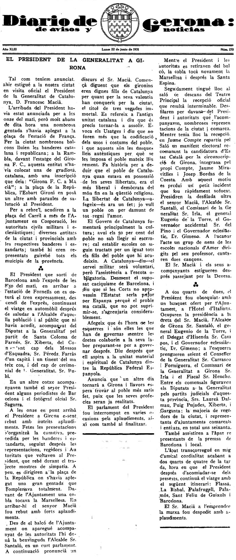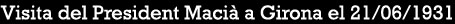El diumenge 21 de juny de 1931 l'arribada del President Macià havia estat anunciada per a les onze del matí, però molt abans una nombrosa gentada s'havia aplegat a la plaça de l'estació de França. Per la ciutat nombrosos balcons lluien les banderes catalana i republicana; a la Rambla, davant la seu del Girona F.C, aquesta entitat n'havia colocat una de grandiosa, catalana, amb la inscripció "Girona F.C. a Macià"; a la plaça del Vi (de la República), l'Esbart Gironí en posà un altre amb paraules de salutació al President.