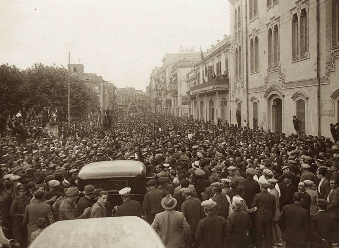 (Ampliar) - Pas de la comitiva pel pont de Pedra. Entre la multitud Francesc Macià acompanat per l'alcalde Miquel Santaló i altres autoritats. Josep Maria Segarra. CRDI - Ajuntament de Girona.