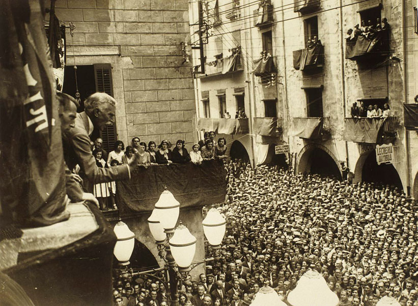 (Ampliar) - Parlament de Francesc Macià des del balcó de l'Ajuntament de Girona. Josep Maria Segarra. CRDI - Ajuntament de Girona. Les visites oficials del president Macià per Catalunya (1931-1933).