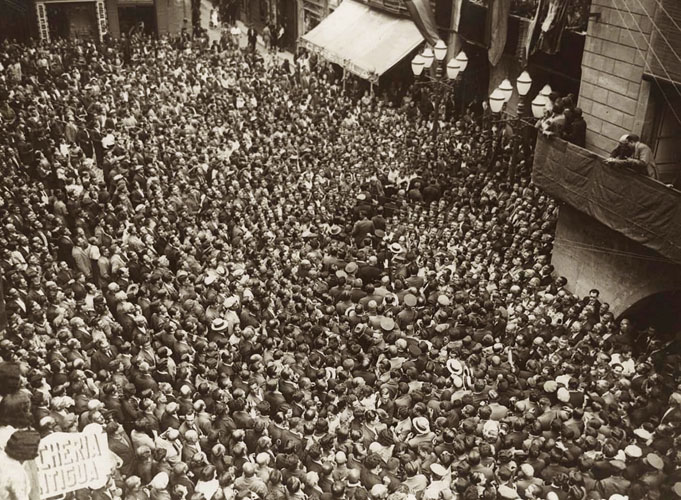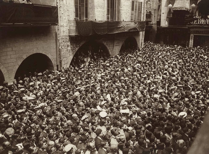 (Ampliar) - Multitud de gent aclamant la presència del president Francesc Macià a la plaça del Vi. Josep Maria Segarra. CRDI - Ajuntament de Girona